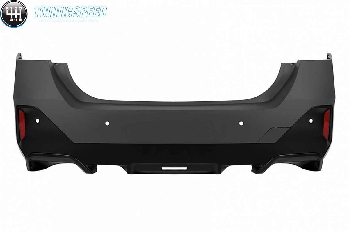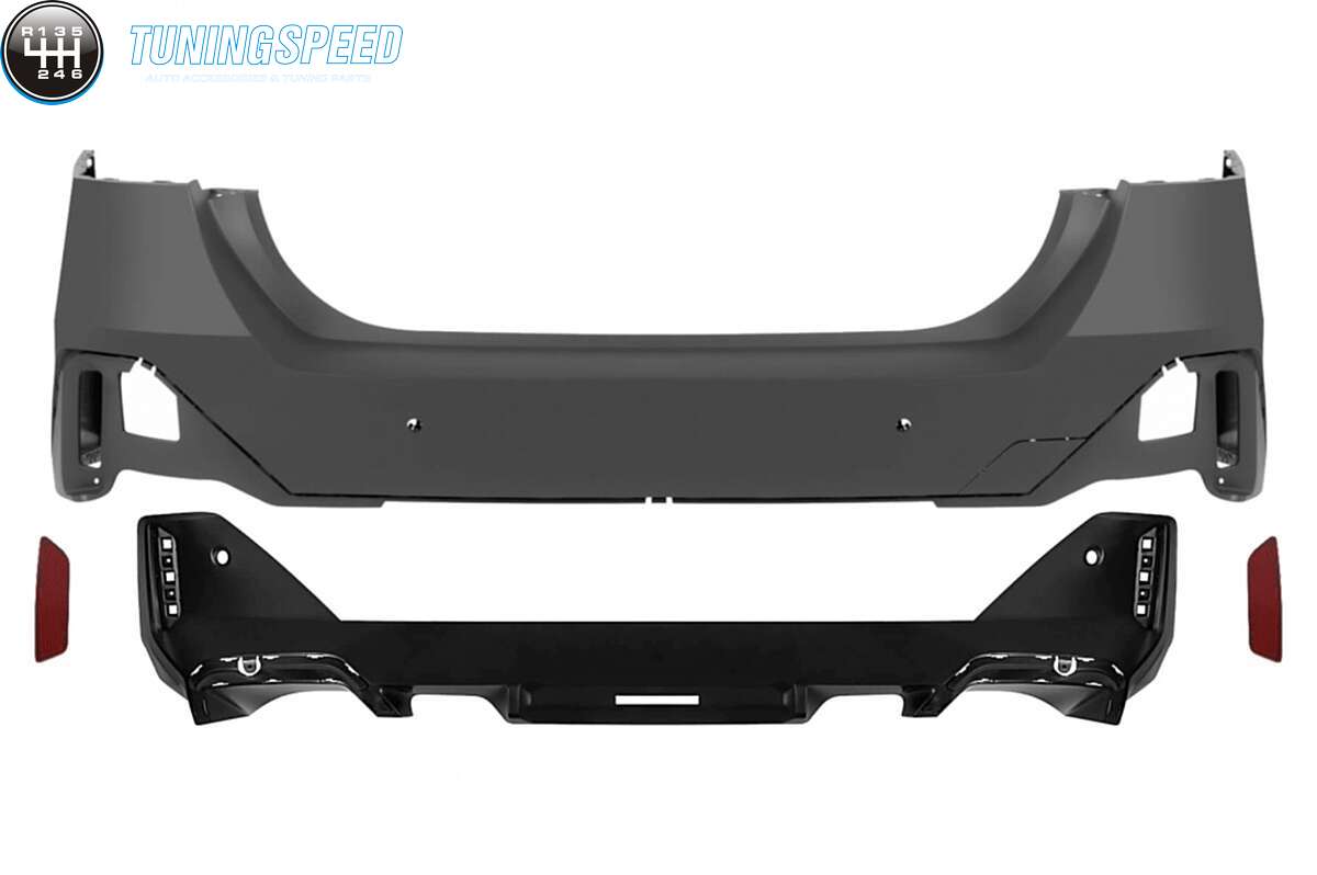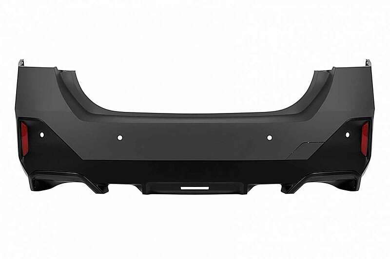Rear bumper equipped with twin outlet diffuser, PDC holes and side reflectors