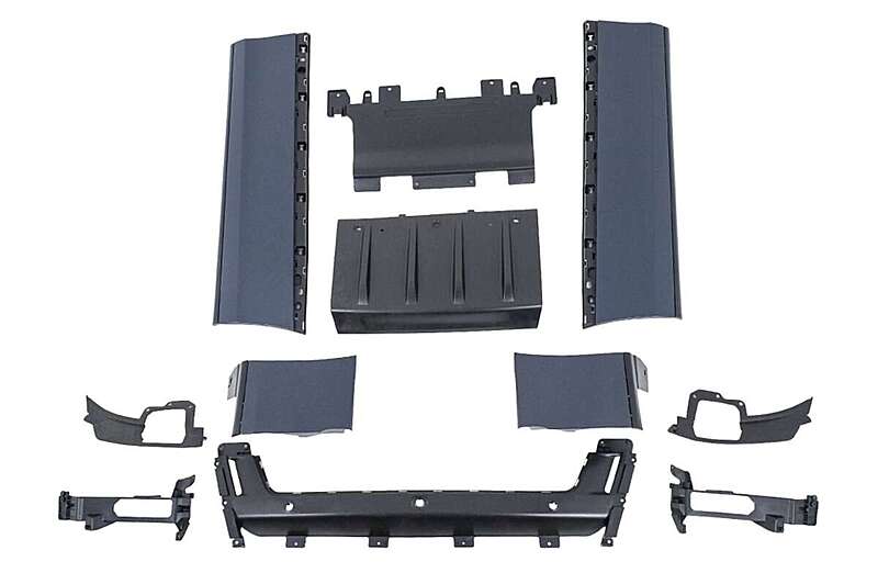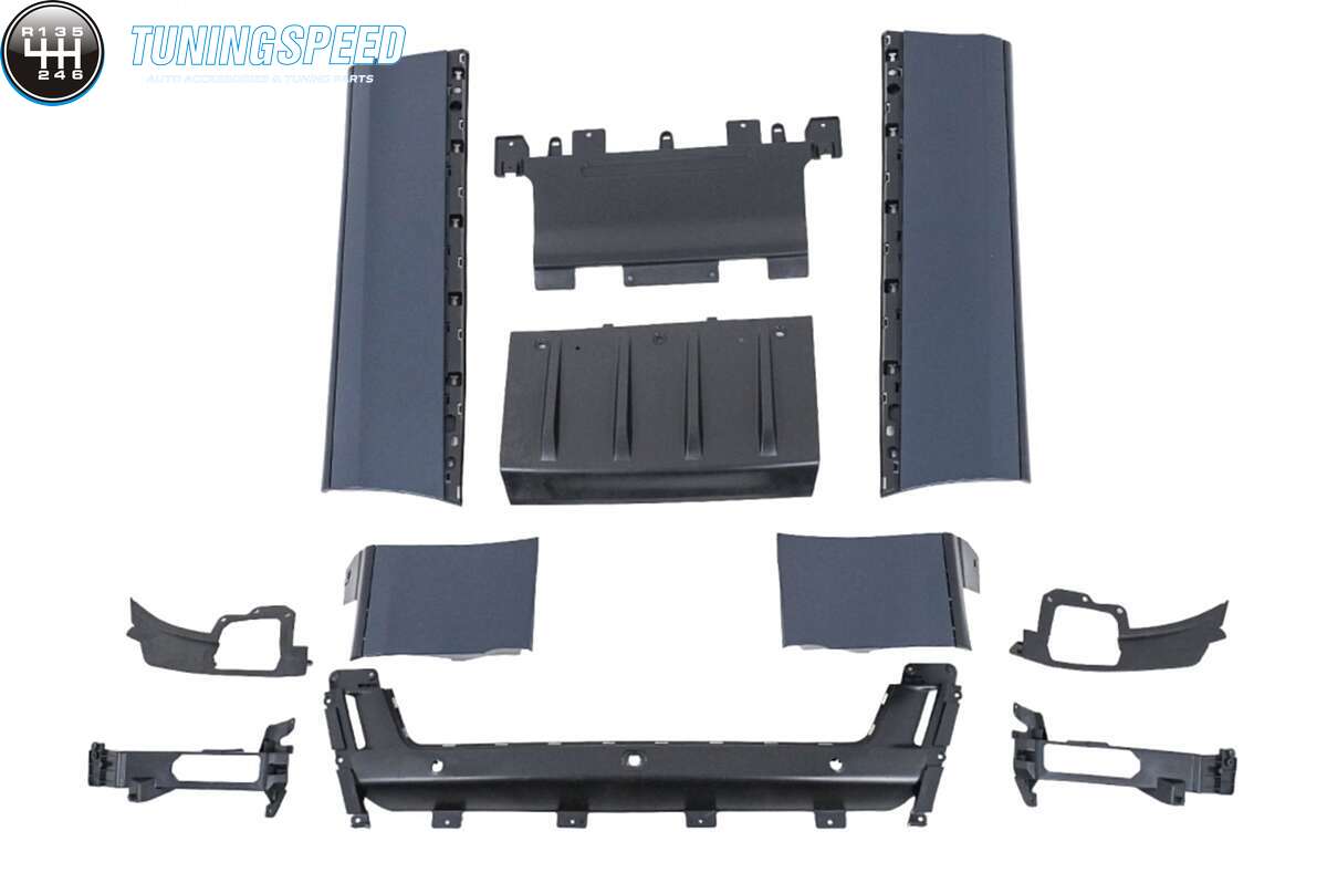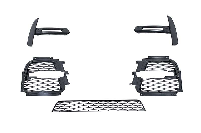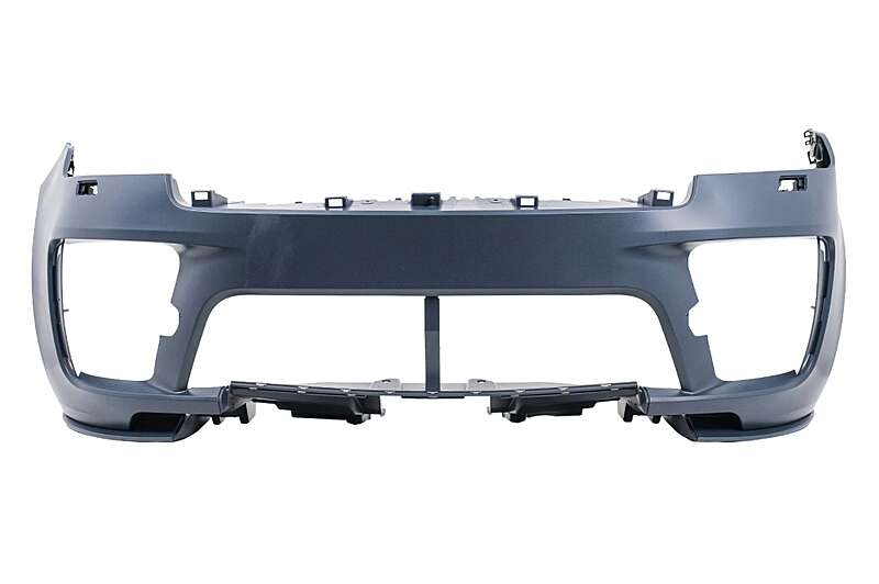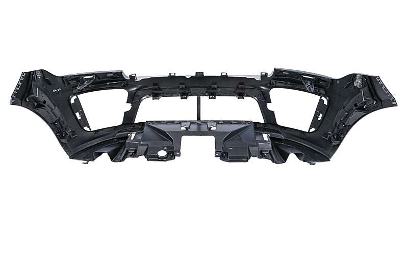 Bumper equipped with central-lower grille, holes for parking sensors (PDC), side grilles, and lower bumper extension.