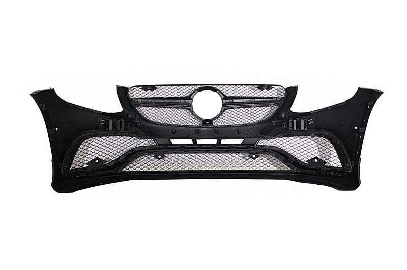 Front bumper equipped with central grille, central-lower grille, side grilles, side fins, parking sensors (PDC) supports and supports for camera system.