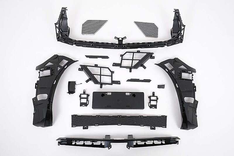Front bumper equipped with central-lower grille, side grilles, PDC holders and front bumper extension spoiler.